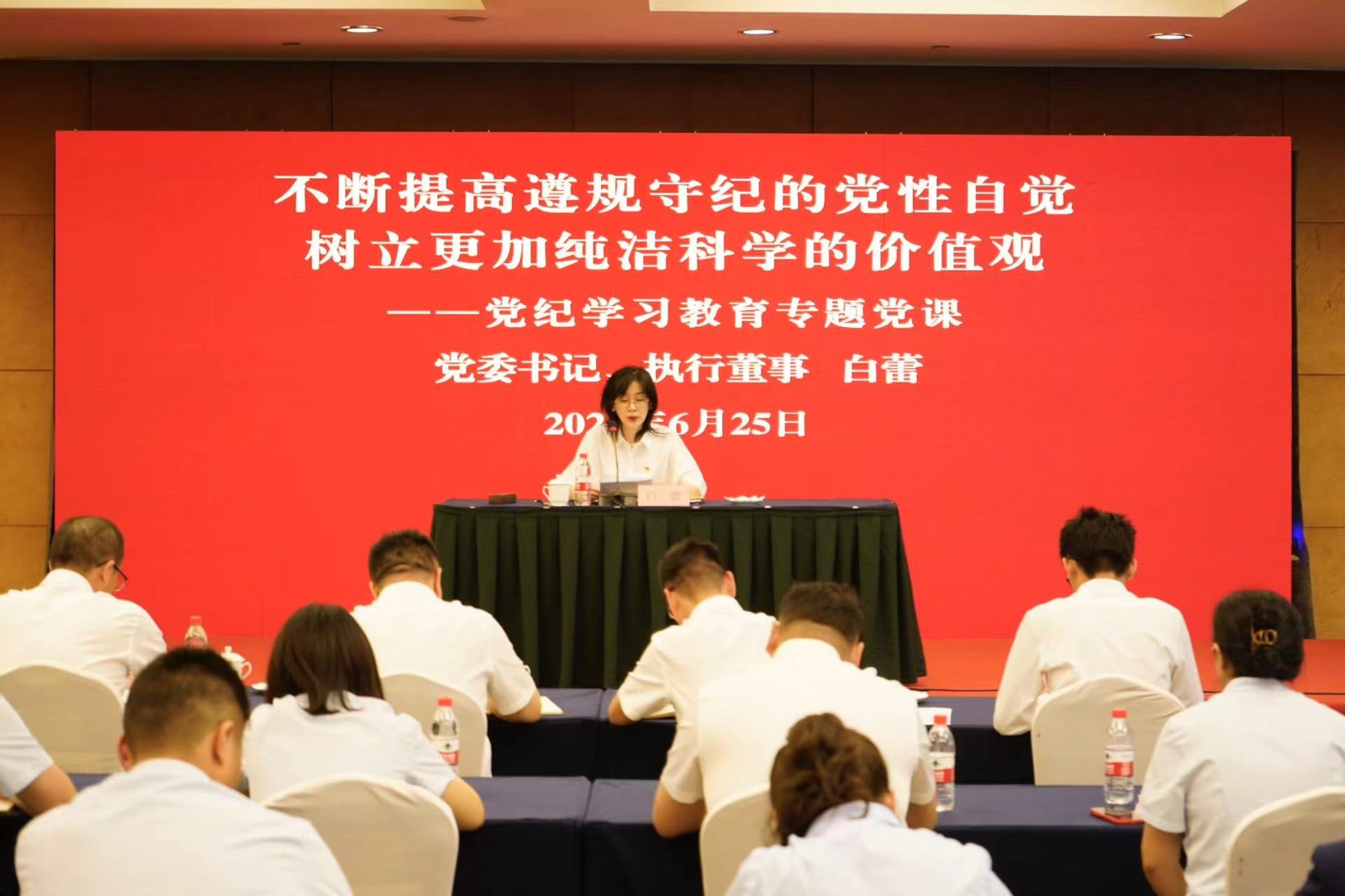 为深入学习贯彻习近平总书记关于加强党的纪律建设的重要论述以及习近平总书记关于党纪学习教育重要讲话和重要指示精神,全面贯彻落实中央和上级党委对学习贯彻新修订《中国共产党纪律处分条例》的部署要求,6月25日上午,川投国网党委书记、执行董事白蕾以《不断提高遵规守纪的党性自觉 树立更加纯洁科学的价值观》为题,为公司党员干部讲授党纪学习教育专题党课。