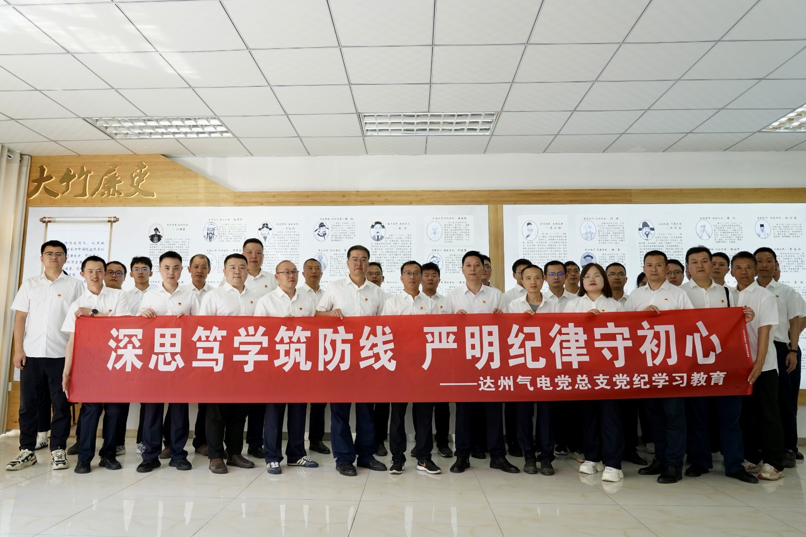 为推进党纪学习教育走深走实,强化党员同志守纪律、讲规矩的政治意识,教育引导党员干部从思想上正本清源、固本培元,营造勤勉务实、清正廉洁的发展氛围。6月25日,公司党总支组织全体党员及入党积极分子,赴大竹竹廉馆开展党纪学习教育主题党日活动。