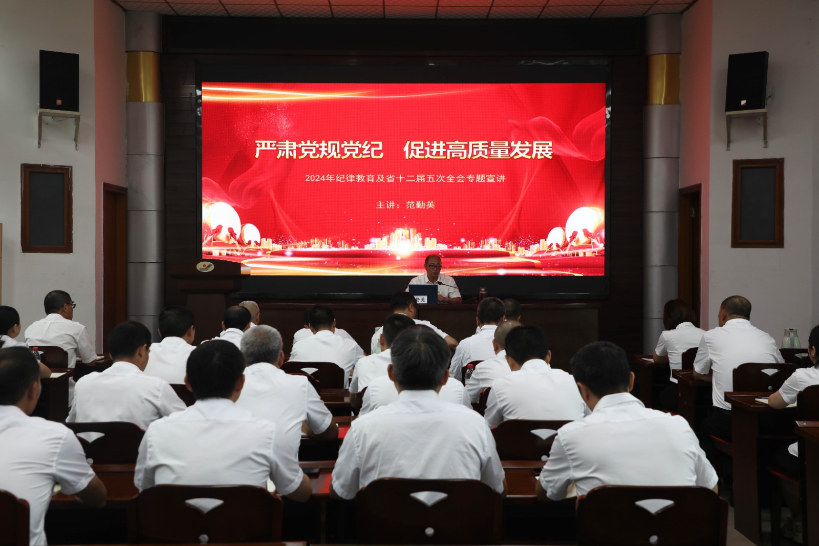 范勤英同志结合具体案例深入解读了新修订的《中国共产党纪律处分条例》,学习贯彻了《国有企业管理人员处分条例》和省委十二届五次全会精神,通过自身理论积累和实践思考,将大理论细化为小选题,用贴心话讲清大道理,讲授了一堂生动有力“接地气”的党课。他指出,党纪学习教育,是加强党的纪律建设、推动全面从严治党向纵深发展的重要举措,纪律是管党治党的“戒尺”,也是党员干部约束自身行为的标准和遵循。知纪才能守纪,心有所畏,方能行有所止。要准确把握主旨要义和规定要求,要把推进党纪学习教育与学习党的创新理论紧密结合起来,不断增强学习针对性与实效性,把党规党纪学清楚弄明白,真正使铁的纪律转化为日常习惯和自觉遵循,做到知敬畏、存戒惧、守底线。他在宣讲省委十二届五次全会精神时指出,省委十二届五次全会精神核心是发展新质生产力,公司要以智能化矿井、智慧化企业建设为抓手,发展新质生产力,推进企业的高质量发展。同时,要自觉把《条例》学习与工作实际结合起来,坚定信心、真抓实干,切实把思想和行动统一到公司发展上来,以忠诚干净担当的实际行动为推动企业高质量发展作出更大贡献。