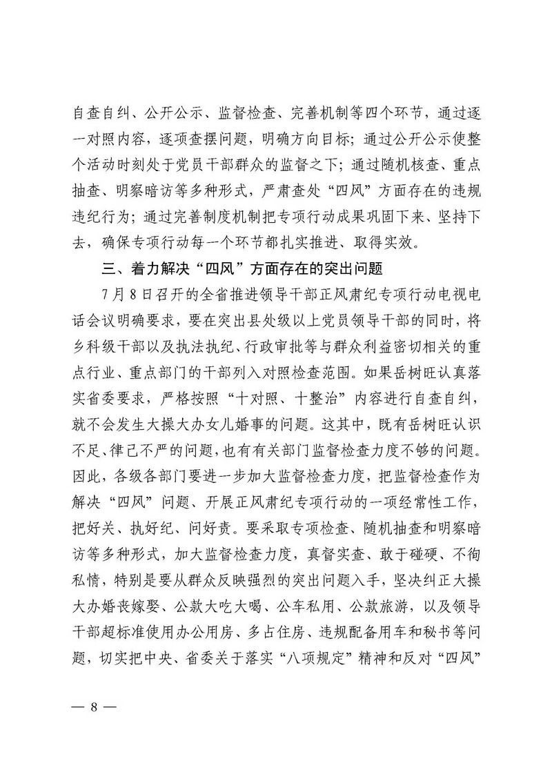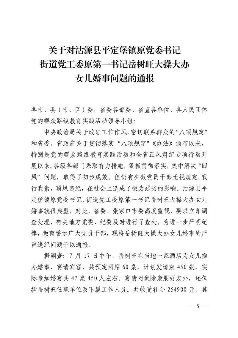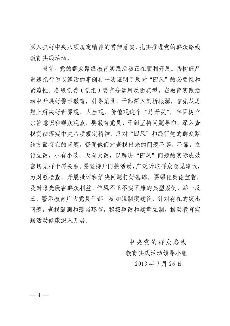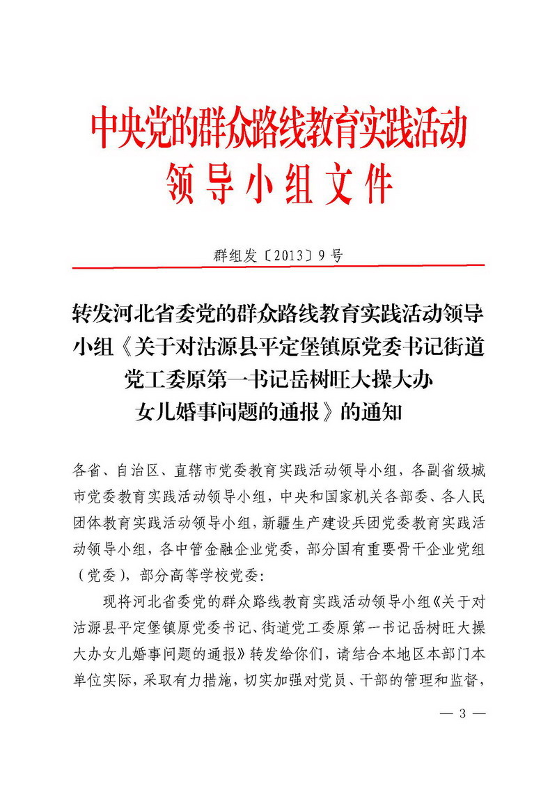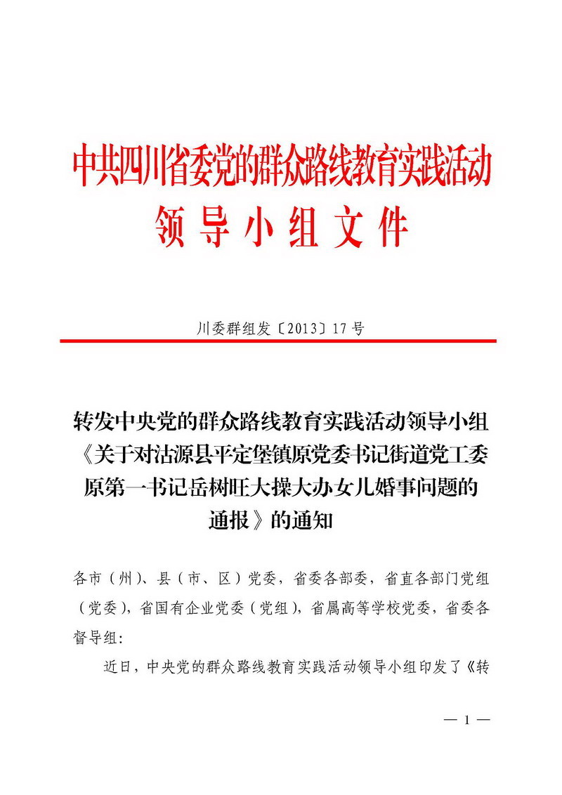 现将中央党的群众路线教育实践活动领导小组印发的《转发河北省党的群众路线教育实践活动<关于对沽源县平定堡镇原党委书记街道党工委原第一书记岳树旺大操大办女儿婚事问题的通报>的通知》(川委群组发[2013]17号)转发你们,请及时组织学习,深入抓好中央八项规定精神的贯彻落实。