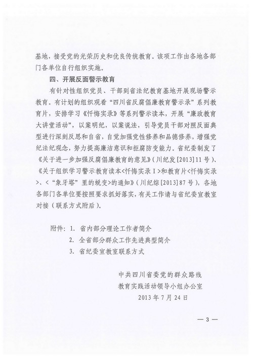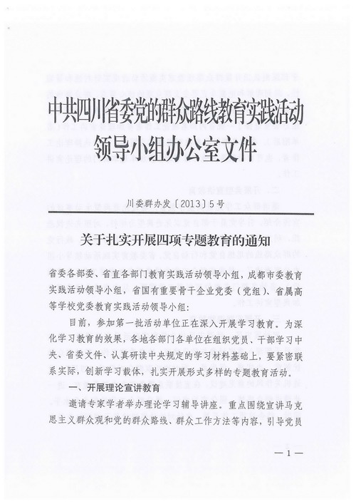 现将中共四川省委党的群众路线教育实践活动领导小组关于印发《关于扎实开展四项专题教育的通知》(川委群办发[2013]5号)转发给你们,请各企业结合自身实际全面认真贯彻落实,紧密围绕“四项专题教育”,深入扎实地开展学习教育活动。