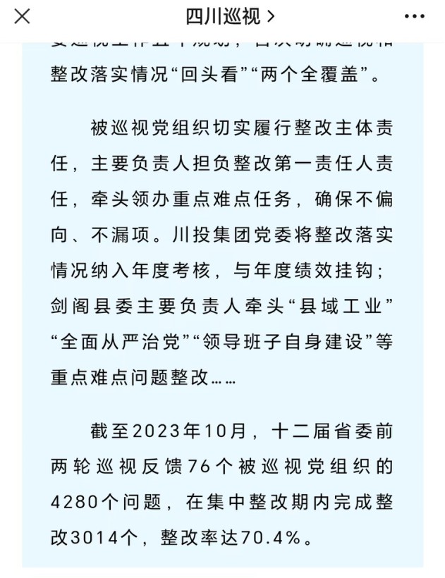 今年2月,中共中央印发了新修订的《中国共产党巡视工作条例》,《条例》单列一章,对巡视整改和成果运用作出具体规定。全省各级党组织坚持把学习贯彻《条例》作为重要政治任务,各被巡视党组织结合工作实际,抓好自身问题整改,不断推动巡视整改和成果运用见真章、出实效。近日,《四川日报》要闻版刊发新闻,专题报道我省推进巡视整改和成果运用相关成效,米兰(中国)党委巡视整改工作经验做法被“点赞”。